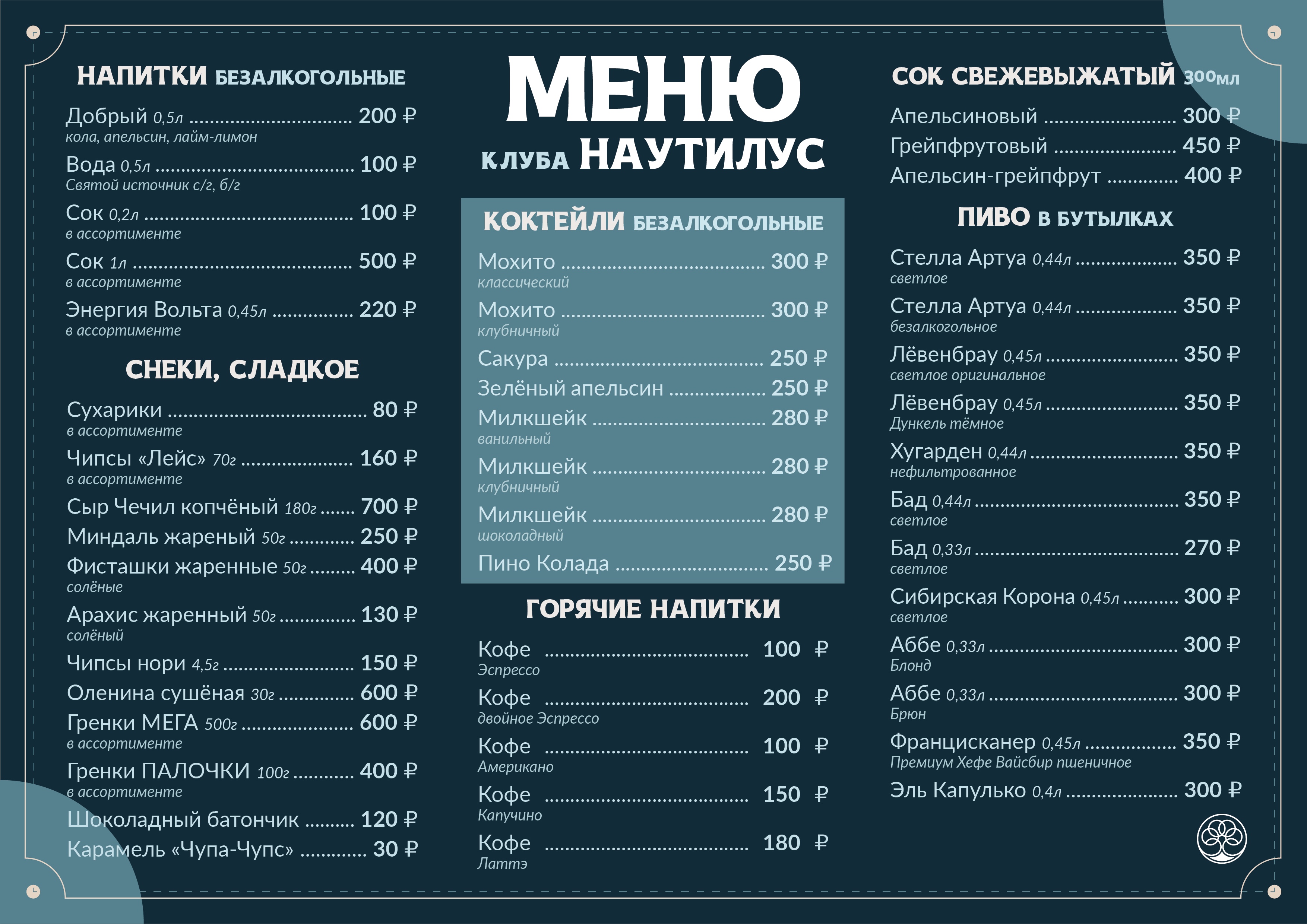 В меню представлен легкие закуски, а также алкогольные и безалкогольные напитки и коктейли.